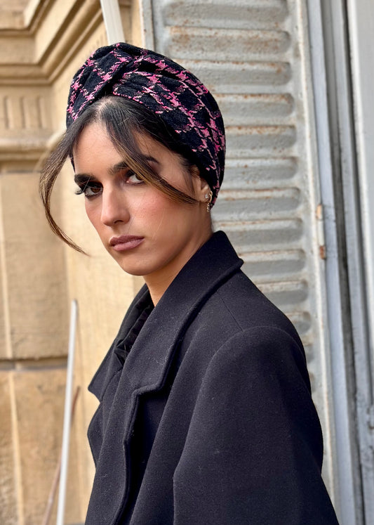 Turban tweed Carreau Noir et Rose