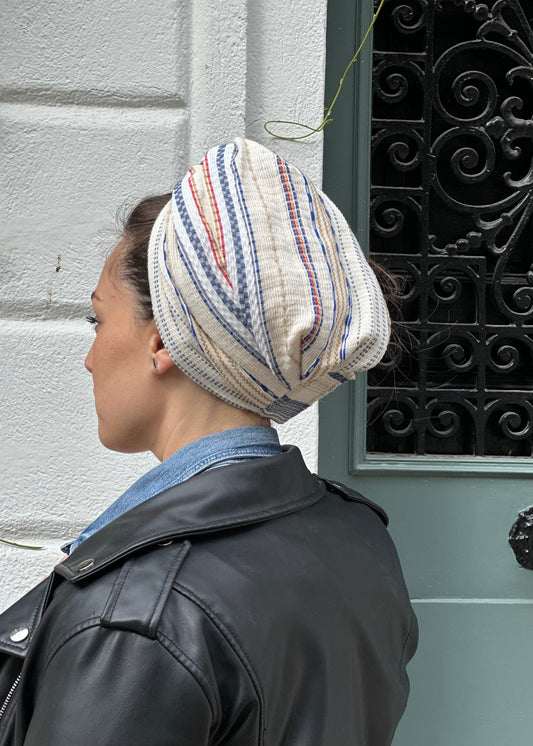 Turban Jacquard Coton Ecru Rayure Bleu Beige Rouge